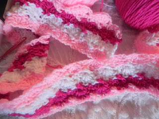 Decided to make a afghan/throw/blanket for Valentines Day. I chose the criss cross stitch and was off....for Valentines I chose the white, rose petal, and shocking pink rose.